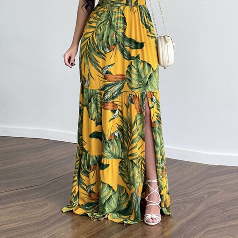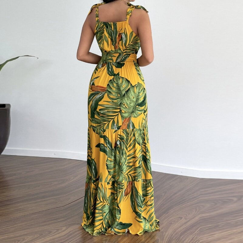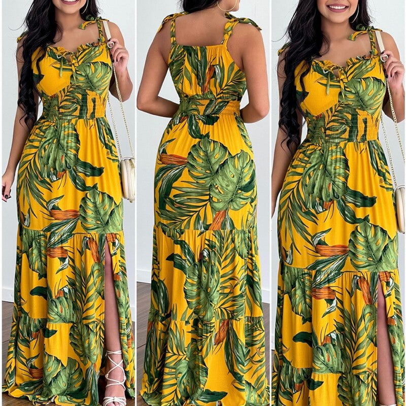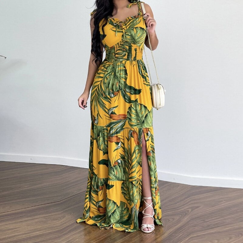 2023 New Summer O-Neck Print Dress Italian Noodle Strap Beach Dress Women’s Sleeveless Lace Up Strap High Waist Split Dress