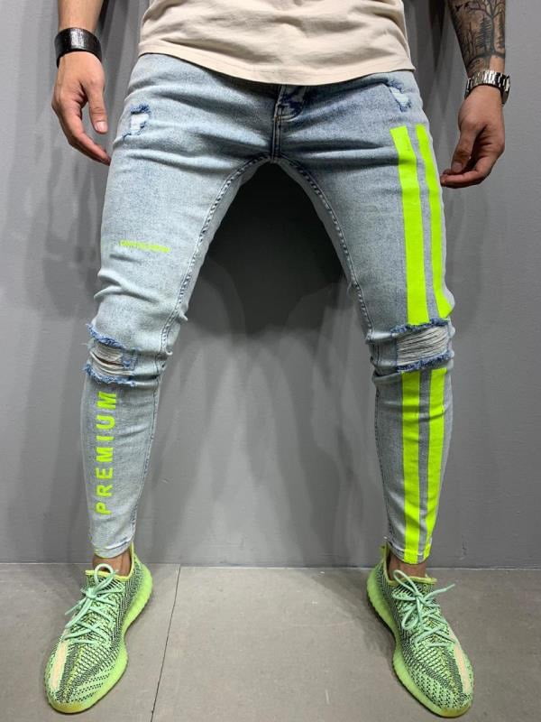 Letter printing Ripped Pencil Jeans Men Skinny Biker Side Striped Jeans Destroyed Hole Hip Hop Slim Fit Jean Men’s Pant